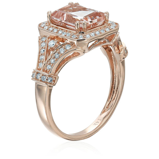 Pinctore 14k Rose Gold Emerald-cut Morganite and Diamond Halo Engagement Ring