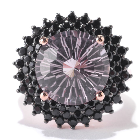 Pinctore 18K Rose Vermeil Over Silver 12mm Round Pink Amethyst,Black Spinel Halo Cocktail Rings