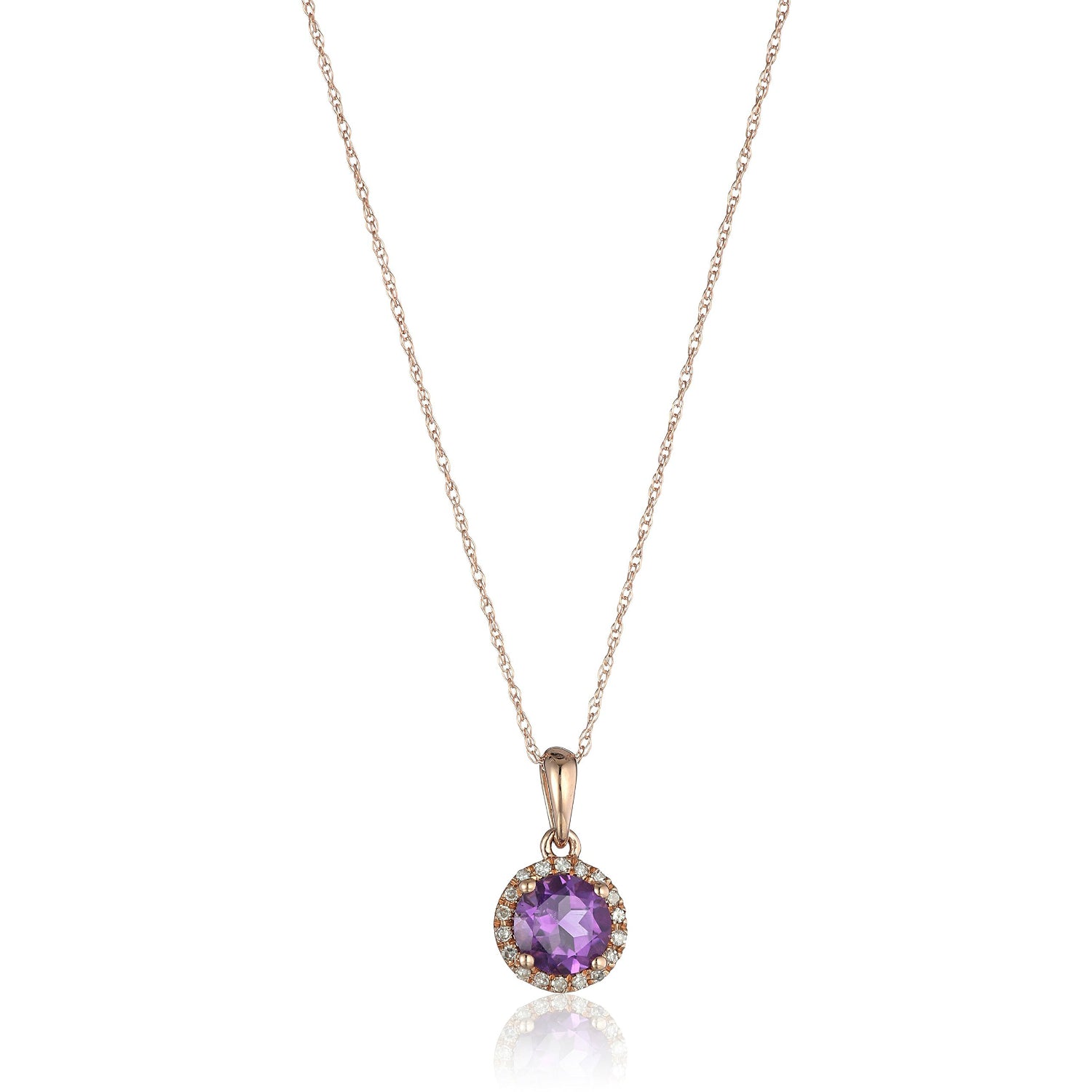 Elevate your style with this exquisite 10k rose gold pendant necklace featuring a captivating African amethyst gemstone accented by sparkling diamonds. The timeless design and 18-inch chain make it perfect for everyday elegance or special occasions. Treat yourself or someone special to this luxurious and sophisticated piece of jewelry.
