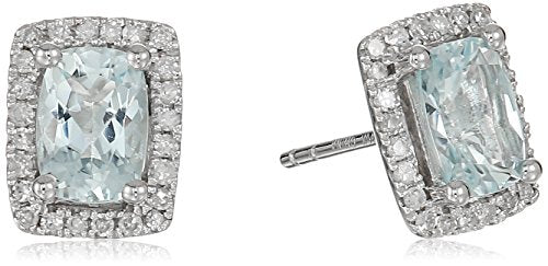 - Design: Classic cushion halo stud earrings featuring a central aquamarine gemstone with a surrounding halo of diamonds.