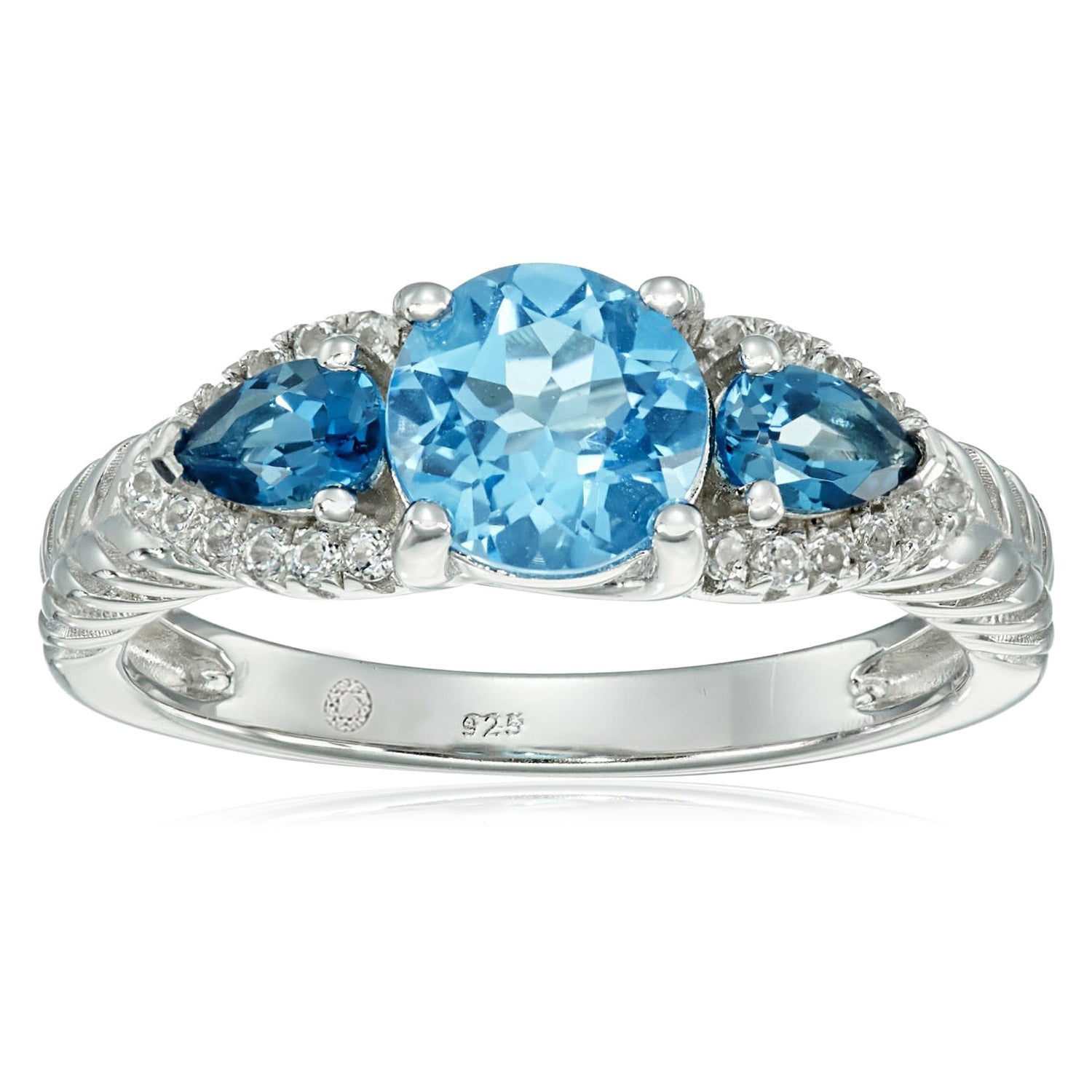 This exquisite 3-stone ring features a vibrant array of gemstones, beautifully set in rhodium over sterling silver. With options including African amethyst, citrine, white topaz, Swiss blue topaz, and rhodolite garnet, this ring is designed to make a statement. The combination of pear and round shapes creates a stunning focal point, enhanced by the sparkle of the accent white topaz.