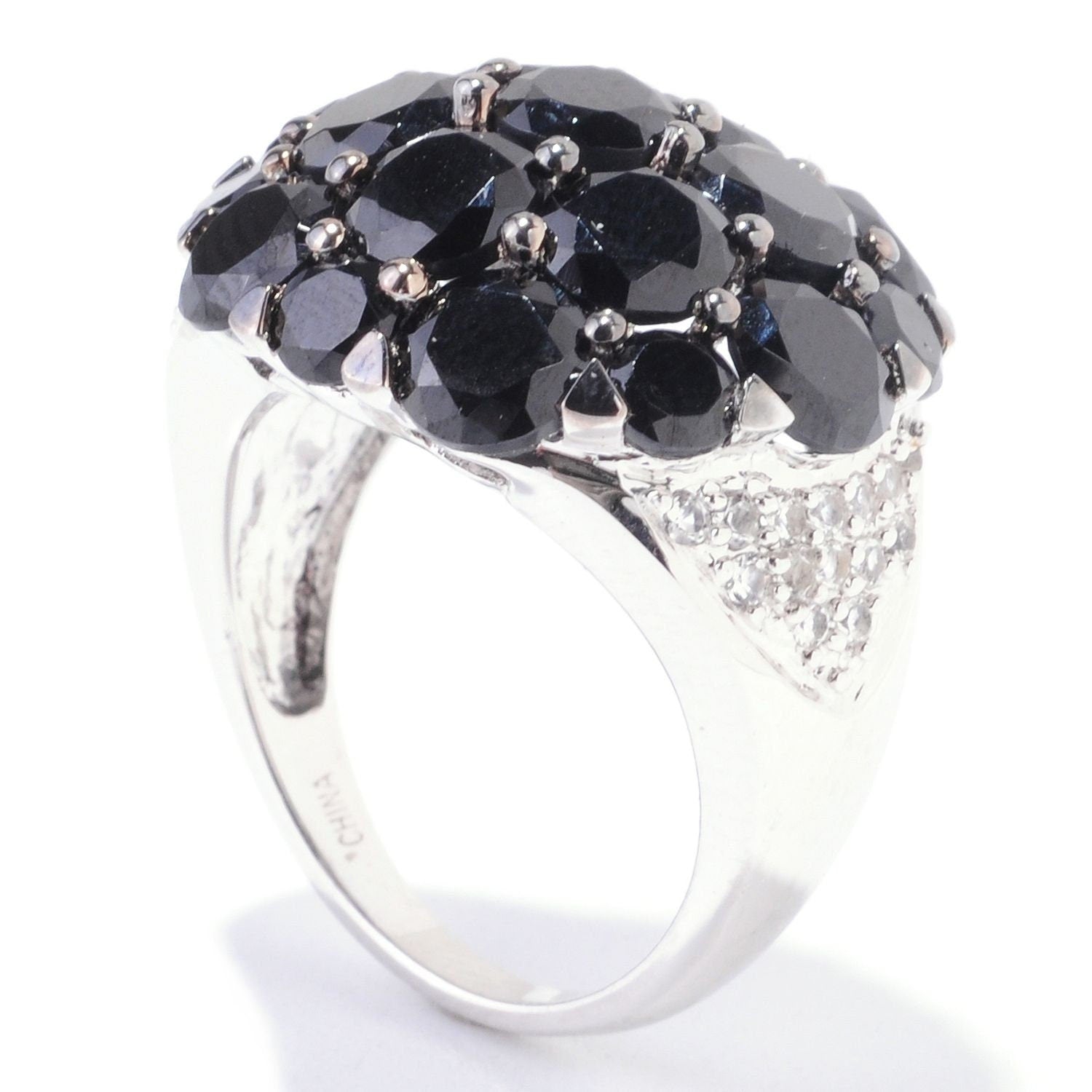 Description: Add a touch of sophistication to your jewelry collection with this exquisite cluster ring featuring black spinel and white topaz. Crafted from rhodium over sterling silver, this ring showcases a striking contrast of colors, making it a perfect accessory for any occasion.