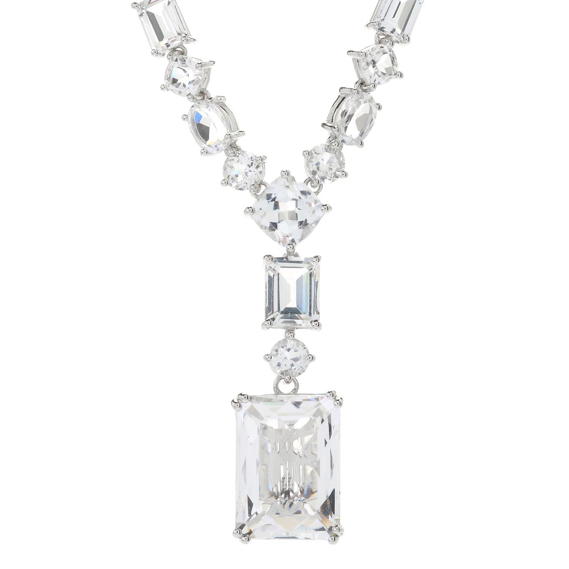 Crafted with rhodium over sterling silver, the necklace boasts a luxurious finish and durability. The design incorporates a mix of round, octagon, and cushion-shaped stones, totaling 54.1 carats across 40 individual stones, creating a vibrant play of color and light.