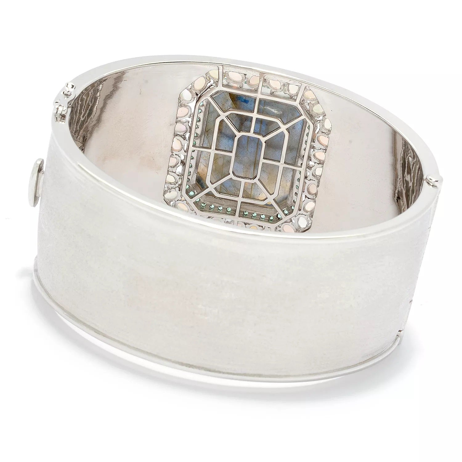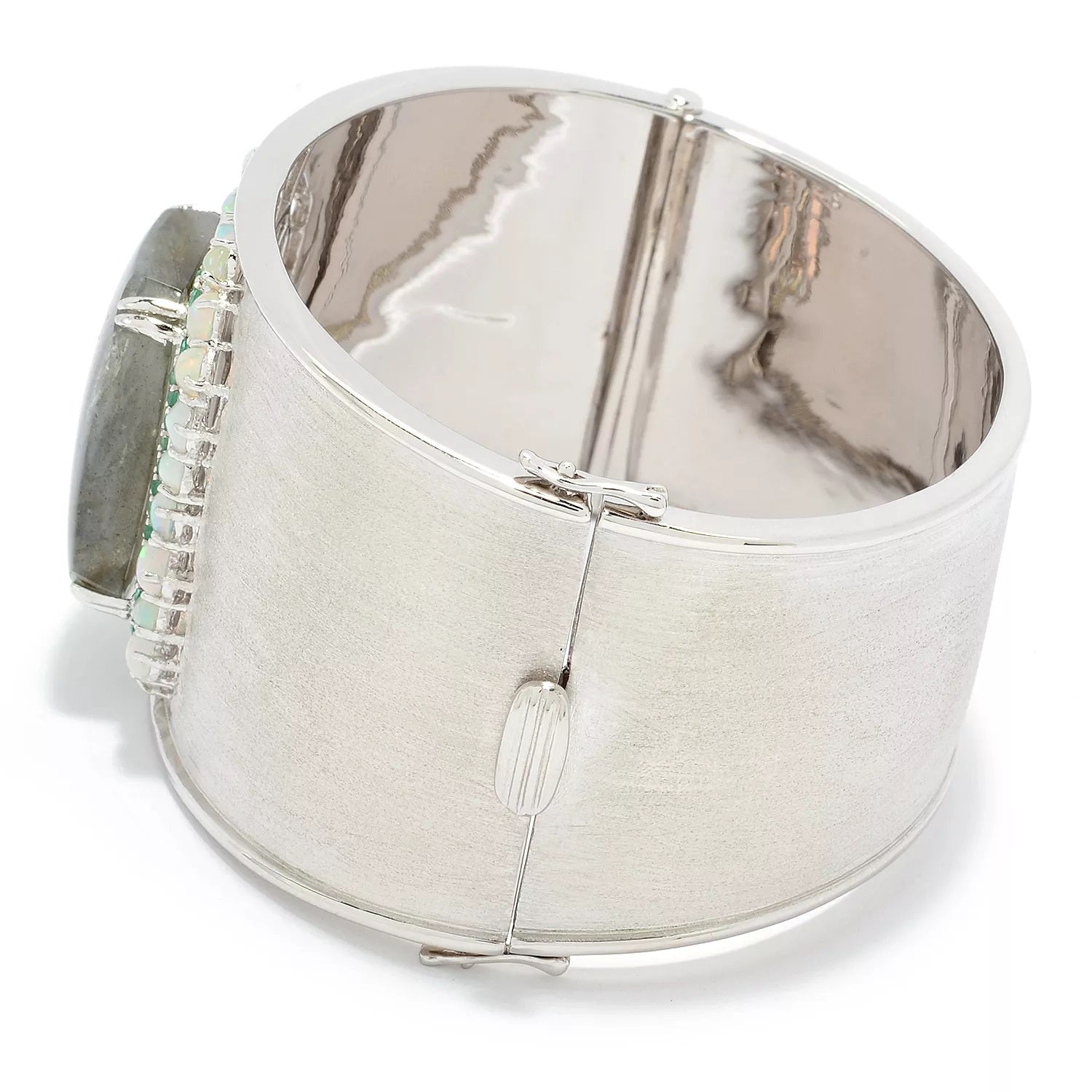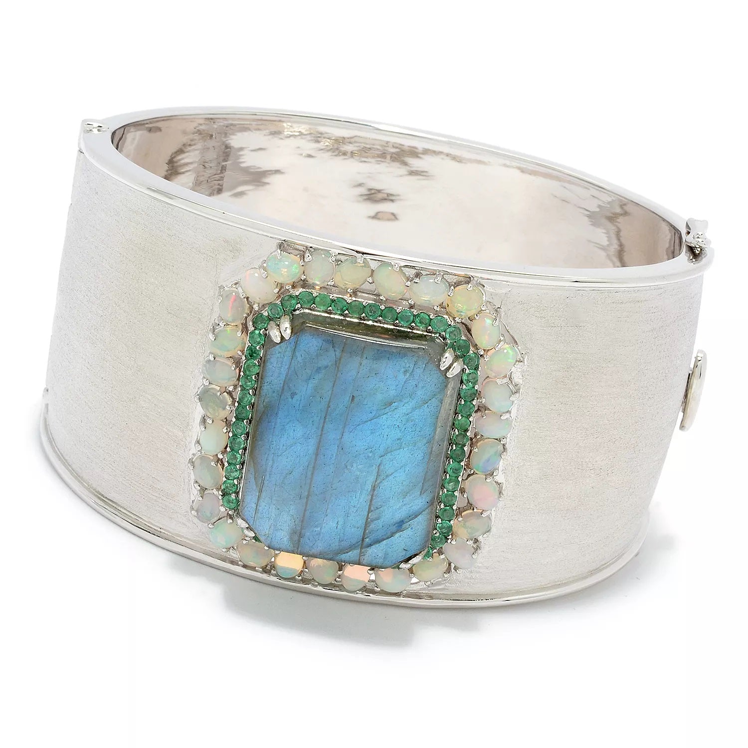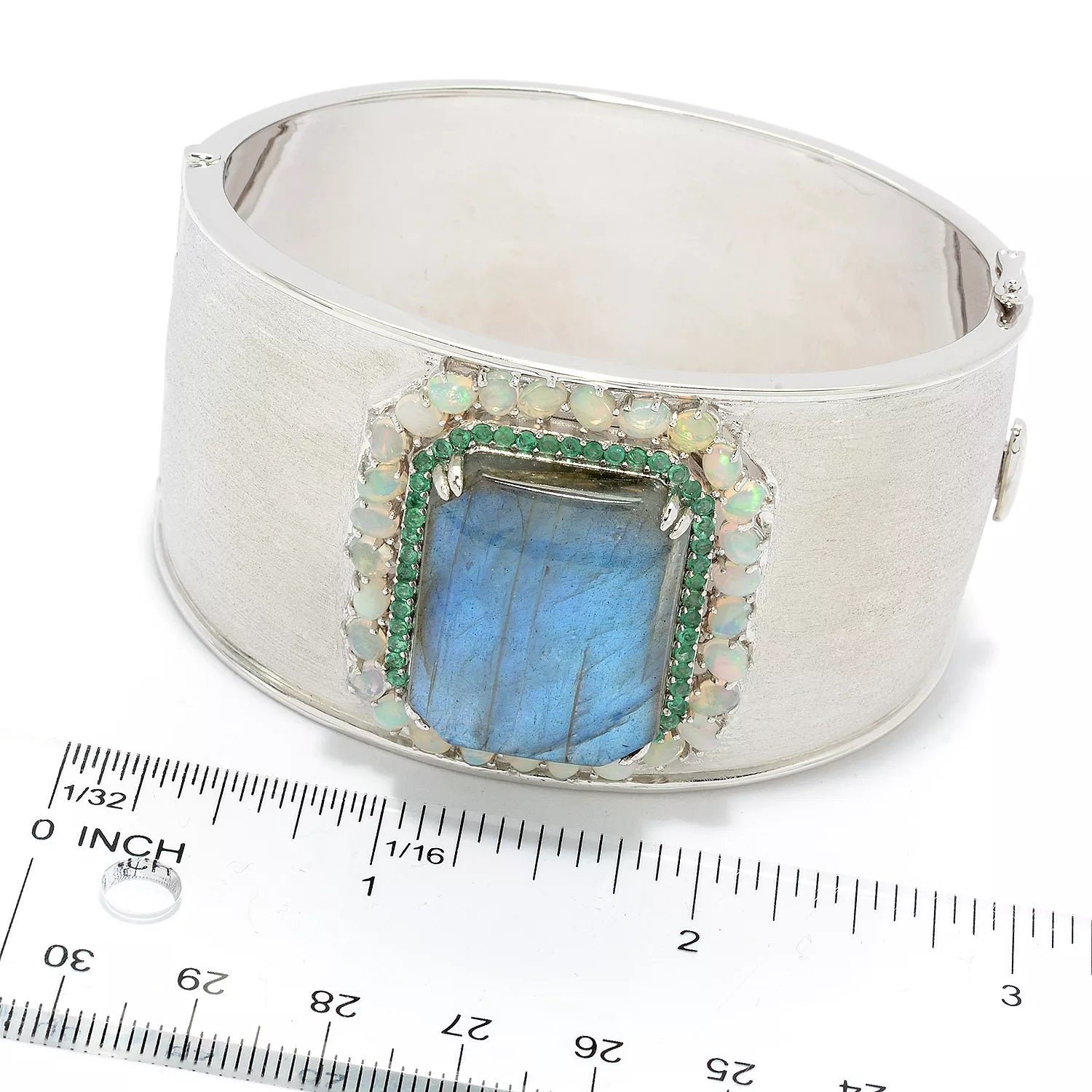 This 925 sterling silver bangle featuring Ethiopian Opal, Brazilian Emerald, and Labradorite offers a luxurious and elegant design, enhancing any outfit with its vibrant colors and sophisticated charm.
