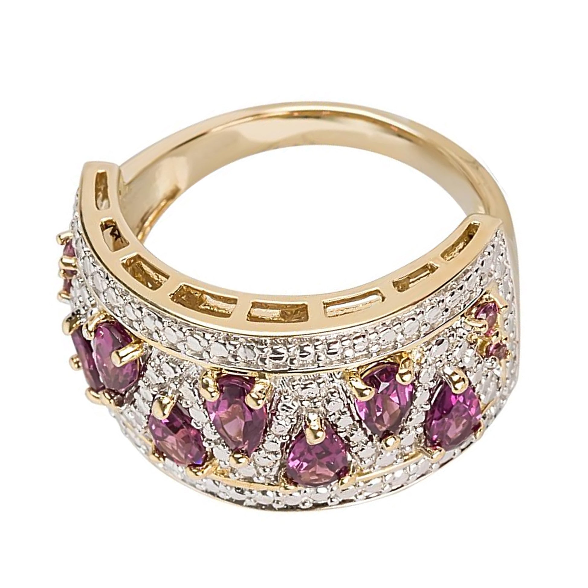 Enhance your jewelry collection with this stunning band ring, featuring an array of vibrant gemstones. Crafted from 925 sterling silver and beautifully plated with 14k yellow gold, this ring showcases a combination of Madeira citrine, iolite, and rhodolite garnet. The thoughtfully designed arrangement of pear and round-shaped gemstones adds a touch of elegance and sophistication.