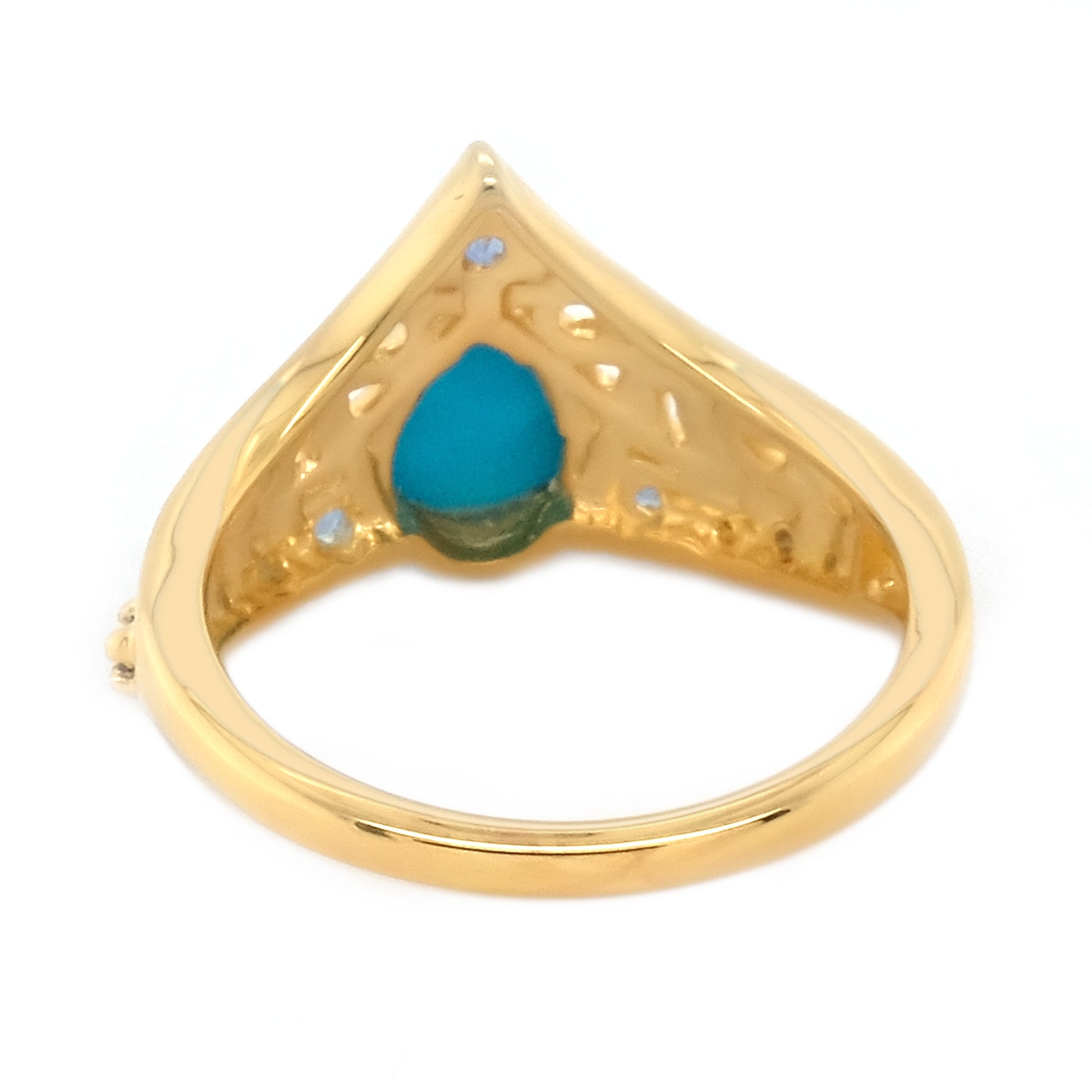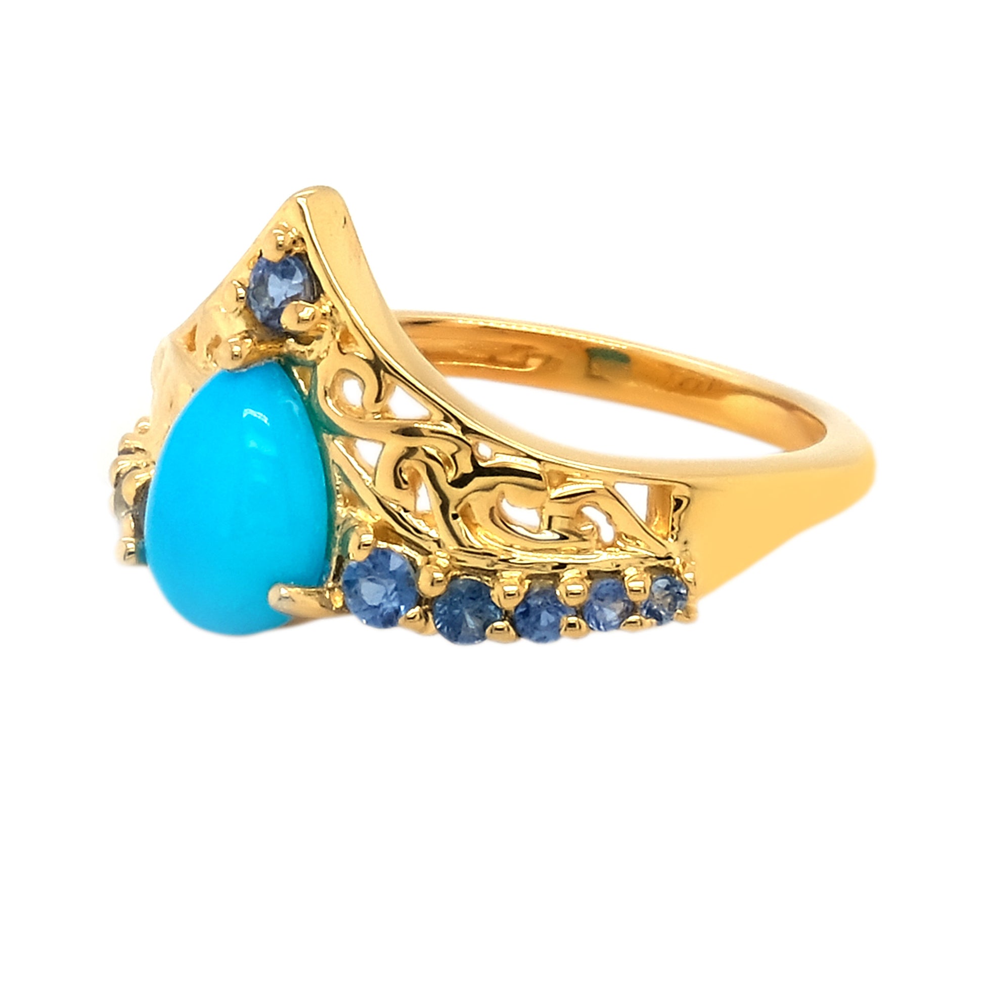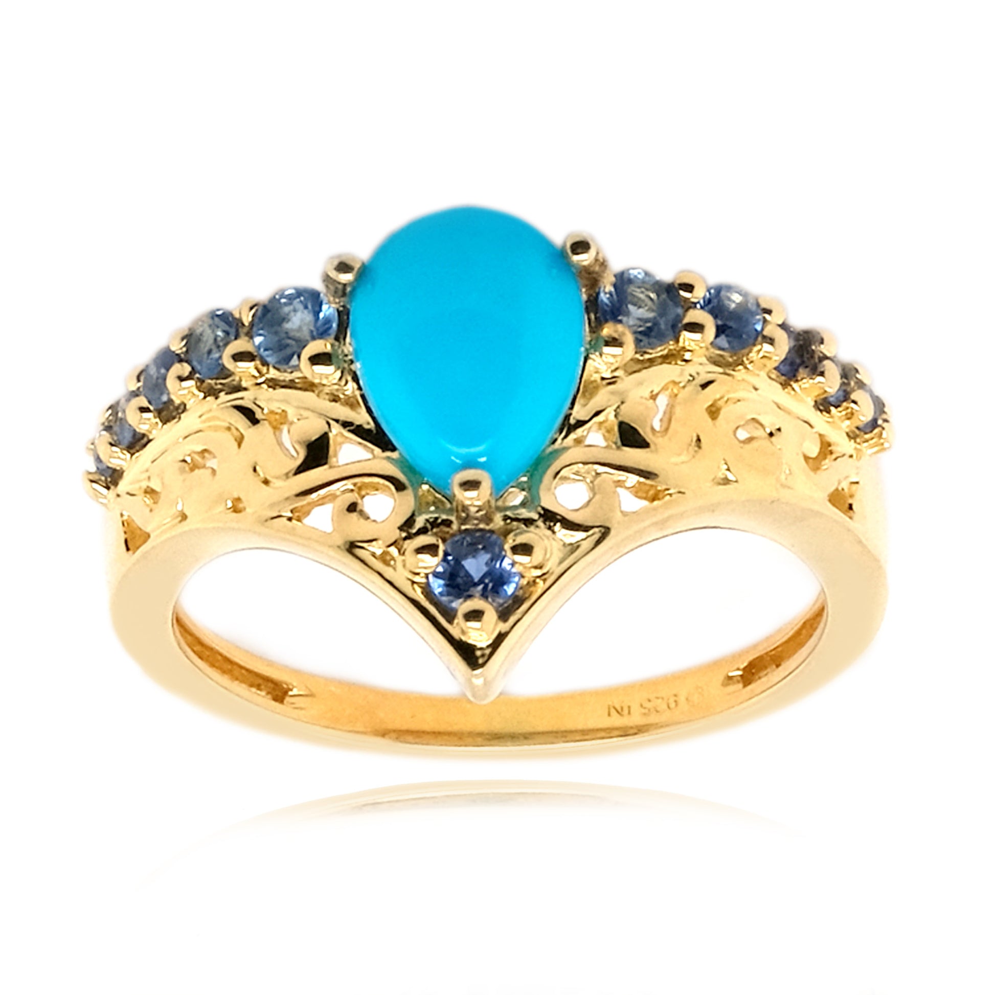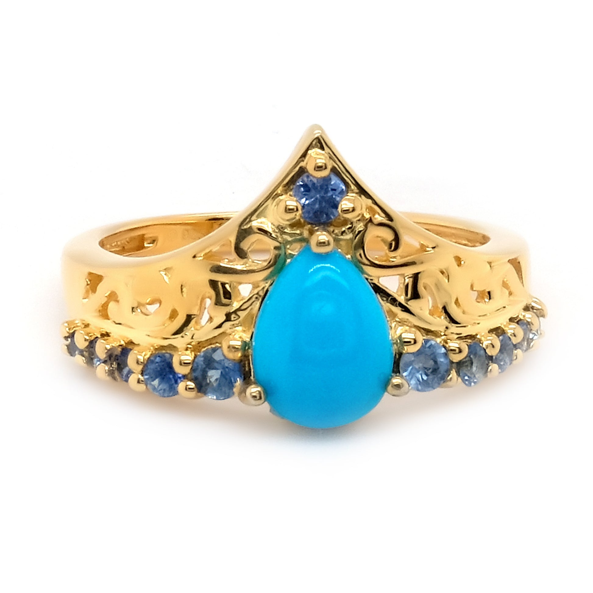 Enhance your jewelry collection with this striking Yellow Gold Plated Over Sterling Silver Band Ring, featuring stunning Sleeping Beauty Turquoise and Ceylon Blue Sapphire gemstones. The ring showcases a combination of vibrant turquoise and brilliant blue sapphires, set in a luxurious yellow gold-plated band. The elegant design incorporates pear-shaped and round gemstones, adding a touch of sophistication and color to your look.