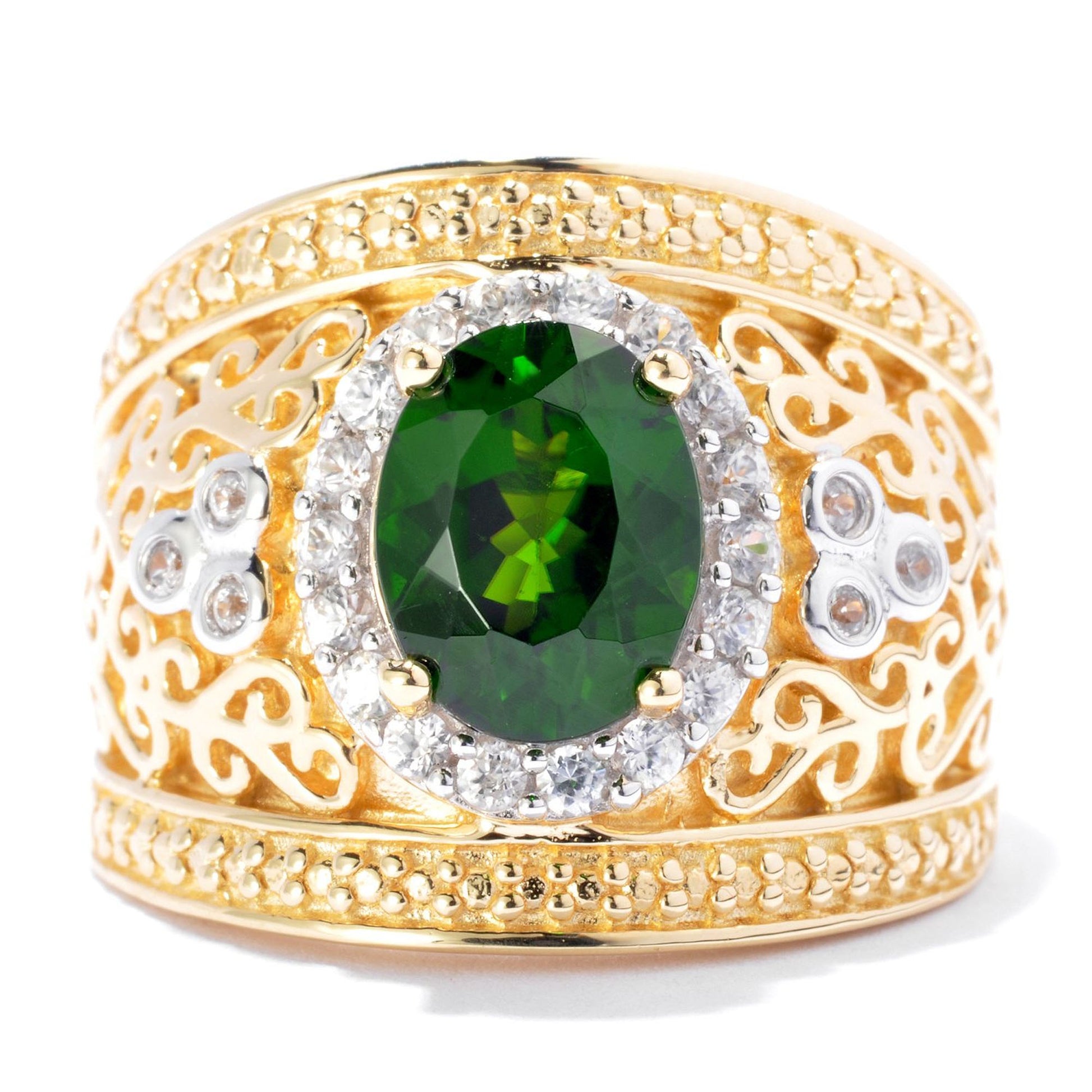 This exquisite band ring showcases a stunning combination of chrome diopside and white zircon gemstones, elegantly set in 925 sterling silver. The centerpiece features a beautiful oval-cut chrome diopside, complemented by sparkling round white zircons. With its vibrant green hues and brilliant accents, this ring is perfect for adding a touch of elegance to any outfit. The prong setting ensures the stones are securely held while allowing maximum light to enhance their natural beauty.