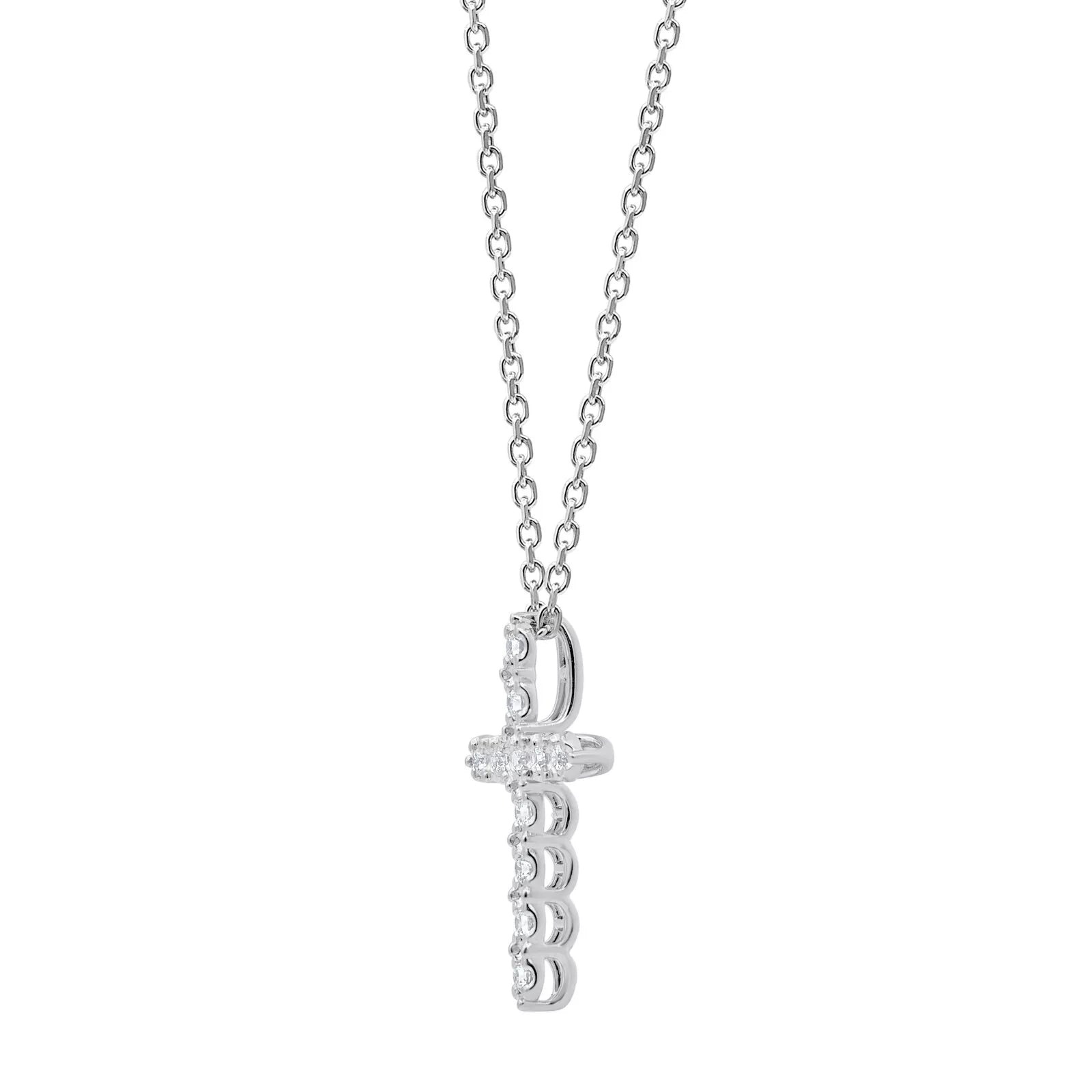 The pendant is suspended from an 18-inch sterling silver cable chain, offering a delicate yet durable design that is both versatile and stylish. The necklace's classic cross shape and white diamonds make it a meaningful accessory, perfect for celebrating special occasions such as anniversaries, birthdays, engagements, weddings, and religious events like confirmations and communions.