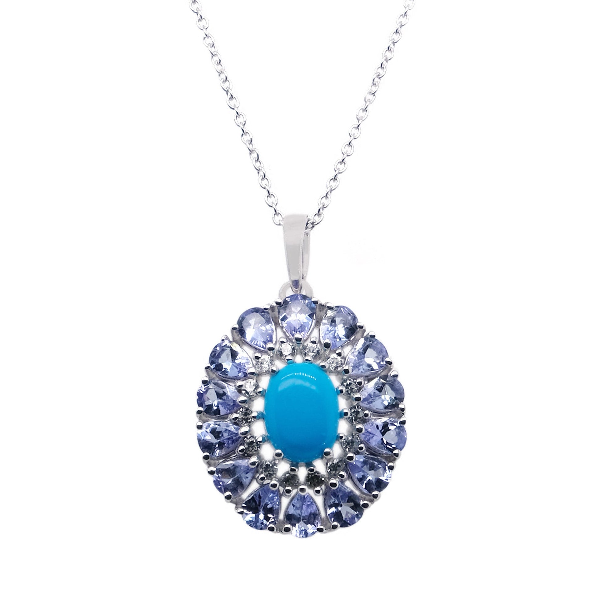 Description: This stunning pendant features the vibrant colors of Sleeping Beauty turquoise and tanzanite, accented with sparkling white zircon. Crafted from high-quality 925 sterling silver, the pendant showcases an elegant design that beautifully highlights the gemstones. With a combination of oval, pear, and round shapes, this piece adds a touch of sophistication and charm, perfect for any occasion.