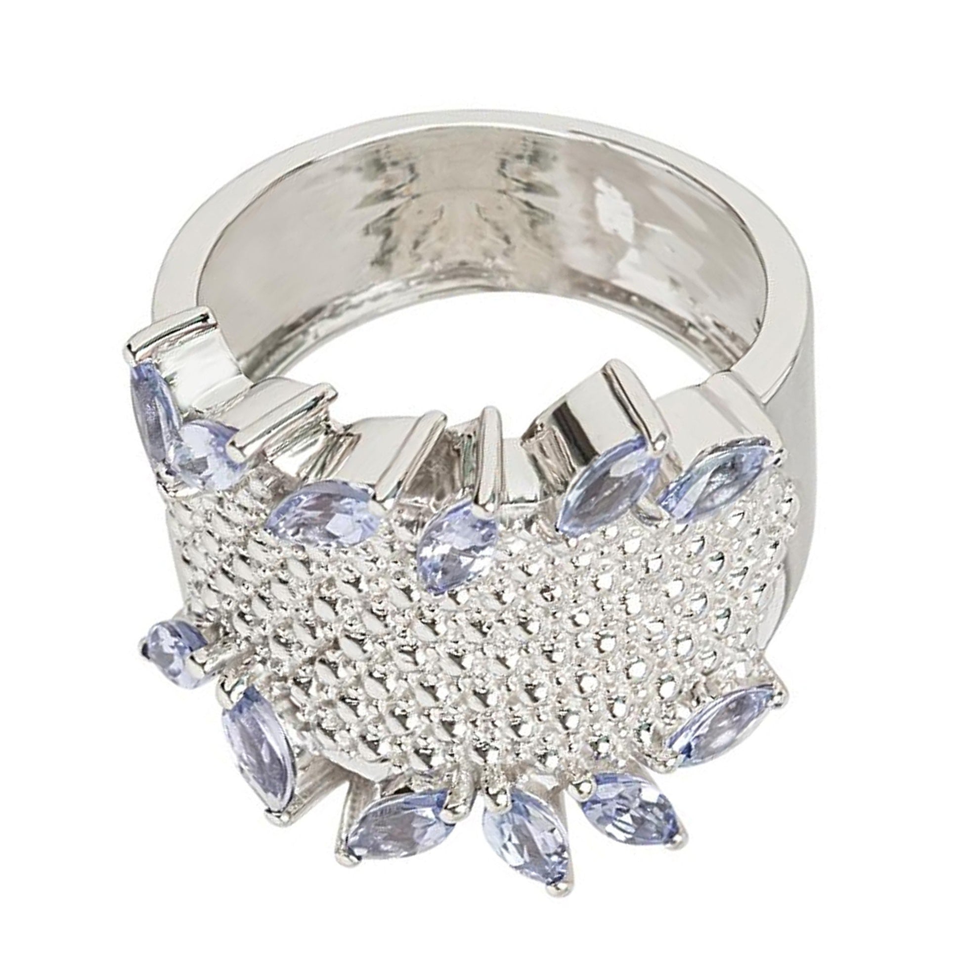 The ring showcases a single marquise-cut tanzanite stone, known for its elongated and elegant shape that amplifies its vibrant blue color. The sterling silver setting provides a sophisticated and timeless backdrop, making this ring a versatile accessory for any occasion.