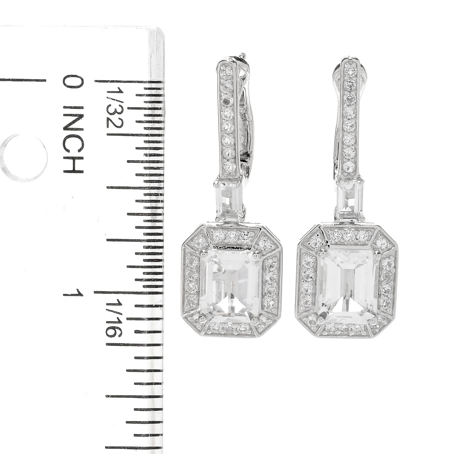 These exquisite earrings from the Pinctore Legacy collection feature a sophisticated arrangement of white topaz gemstones. With two rectangular emerald-cut topaz (9 x 7mm and 5 x 3mm) and various round modified-brilliant cut topaz (1.5mm), these earrings provide a dazzling display of elegance. Set in rhodium over sterling silver with a prong setting, the earrings are versatile with a post or clip-on backing, making them suitable for any preference. The 1.25-inch length and intricate design make these earrings a standout addition to any jewelry collection.
