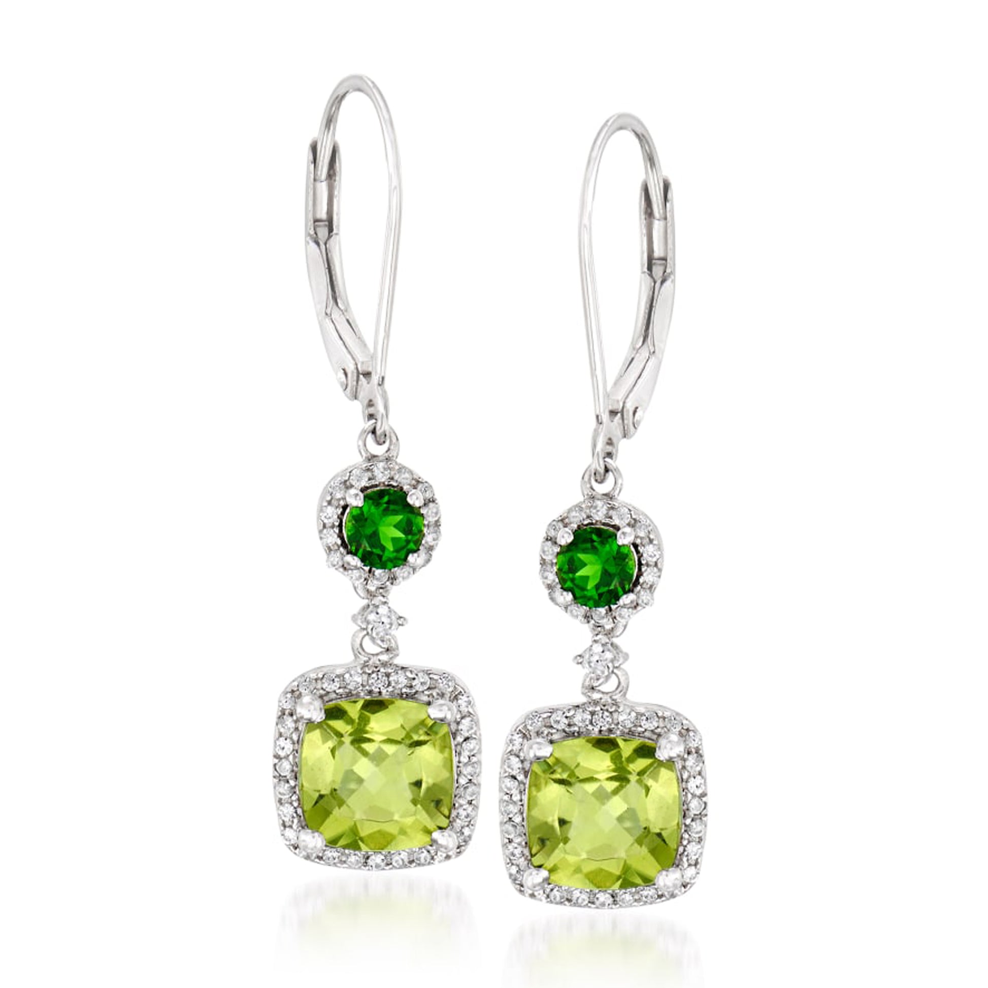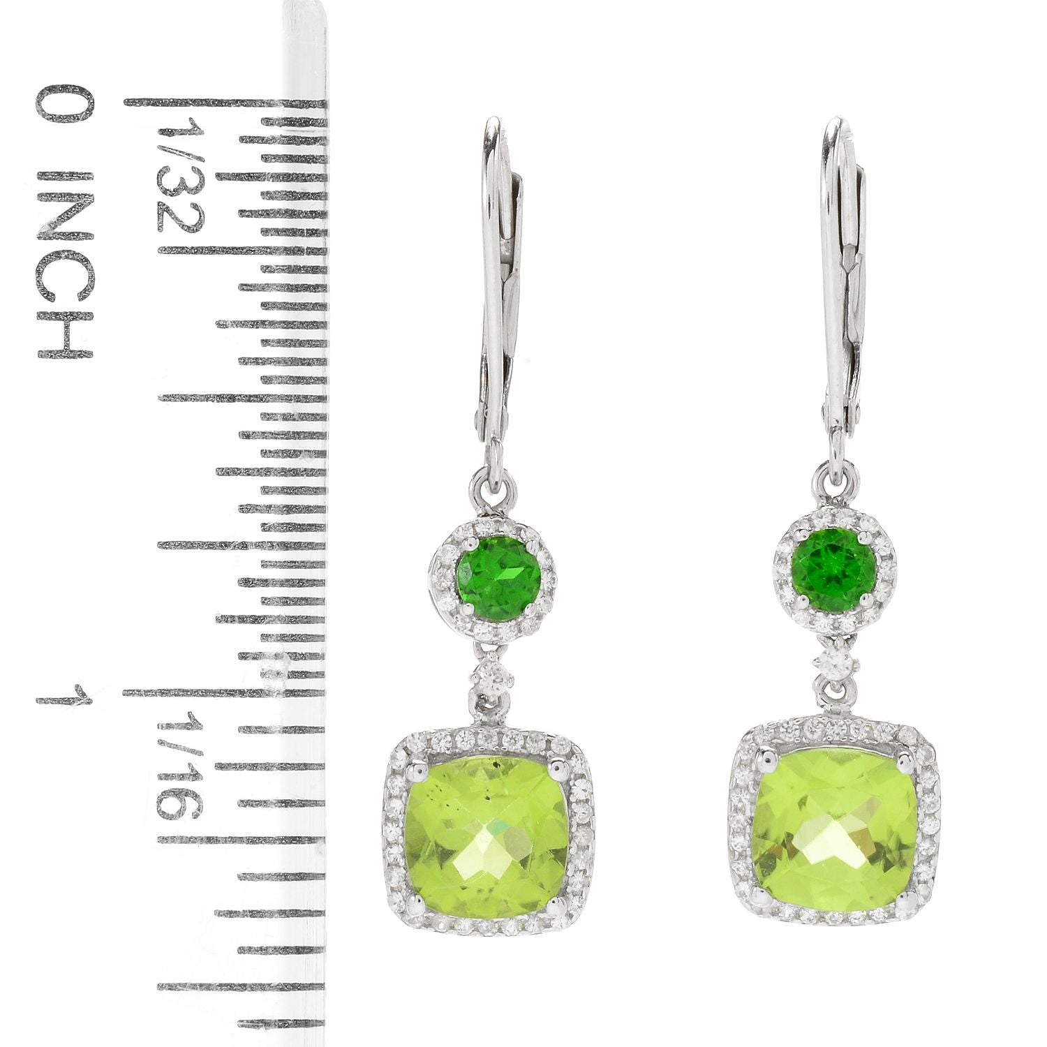 Peridot Variation: Featuring vibrant Peridot stones paired with Chrome Diopside and White Zircon, these earrings offer a refreshing burst of green tones. The cushion and round cuts create a dynamic play of light and color, set in prong and pave settings for added brilliance.