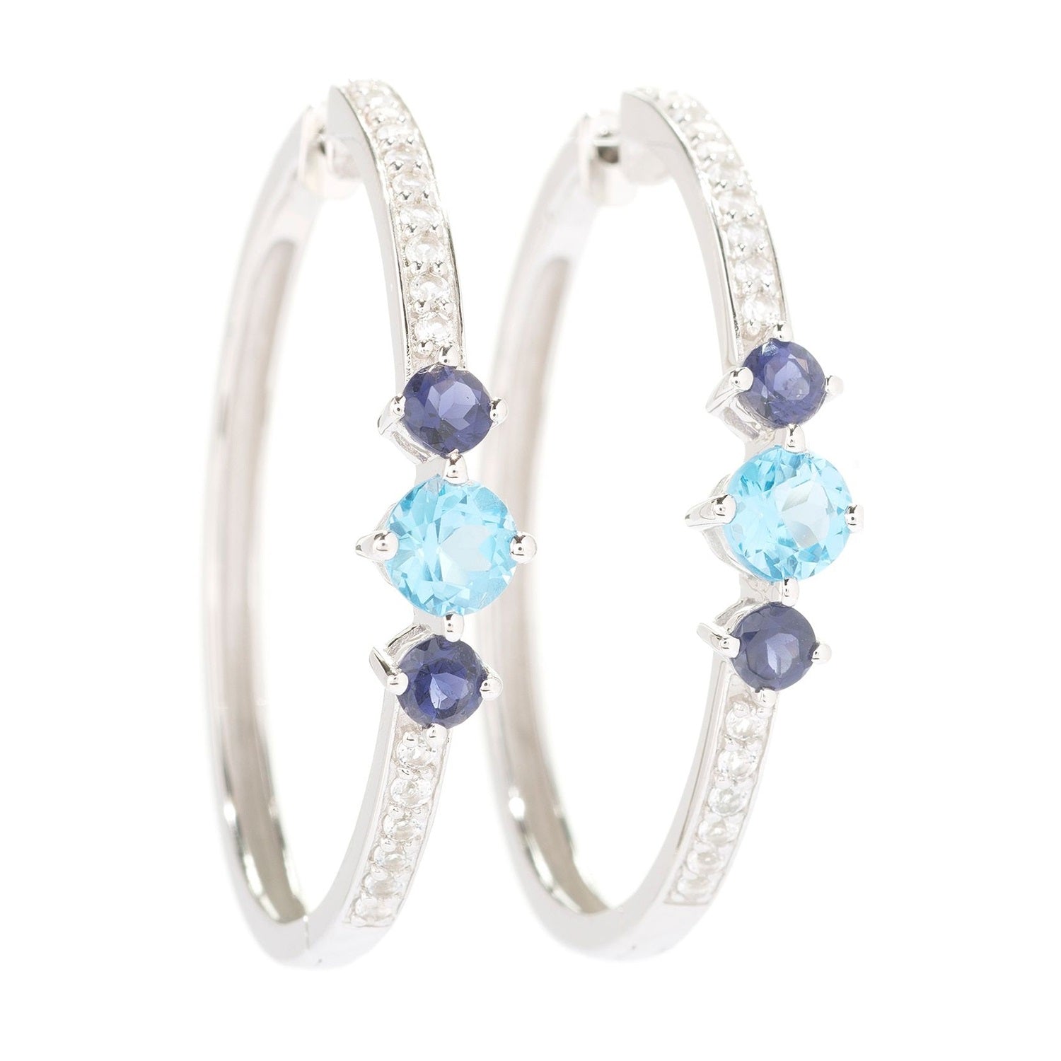 Swiss Blue Topaz Earrings: Brighten your ensemble with captivating Swiss blue topaz, iolite, and white topaz gemstones. The round blue topaz shines brilliantly against the deep iolite and sparkling white topaz, creating a fresh, vibrant look. Set in sleek 925 sterling silver, these earrings are perfect for adding a splash of color to your wardrobe.