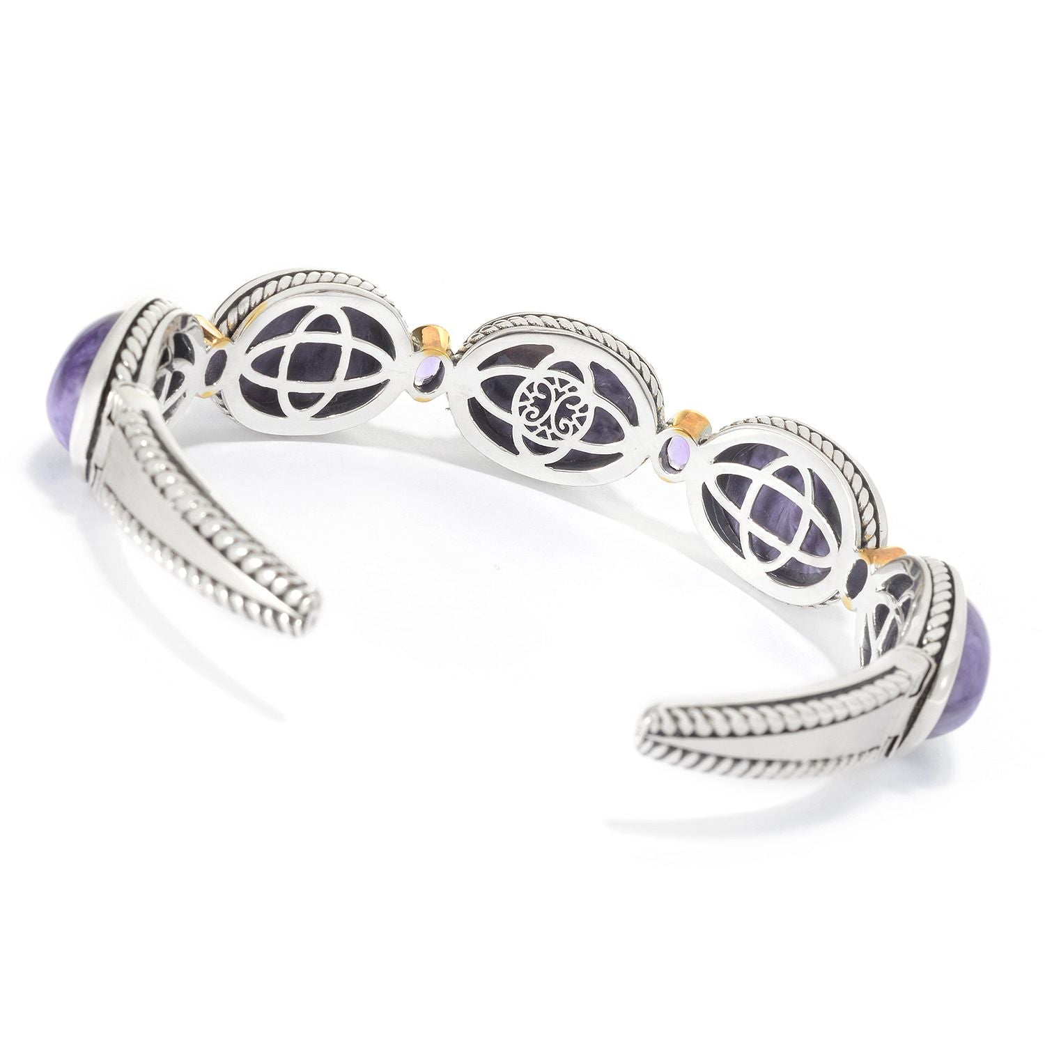 Pinctore Sterling Silver 16 x 12mm Charoite & Amethyst Cuff Bracelet
