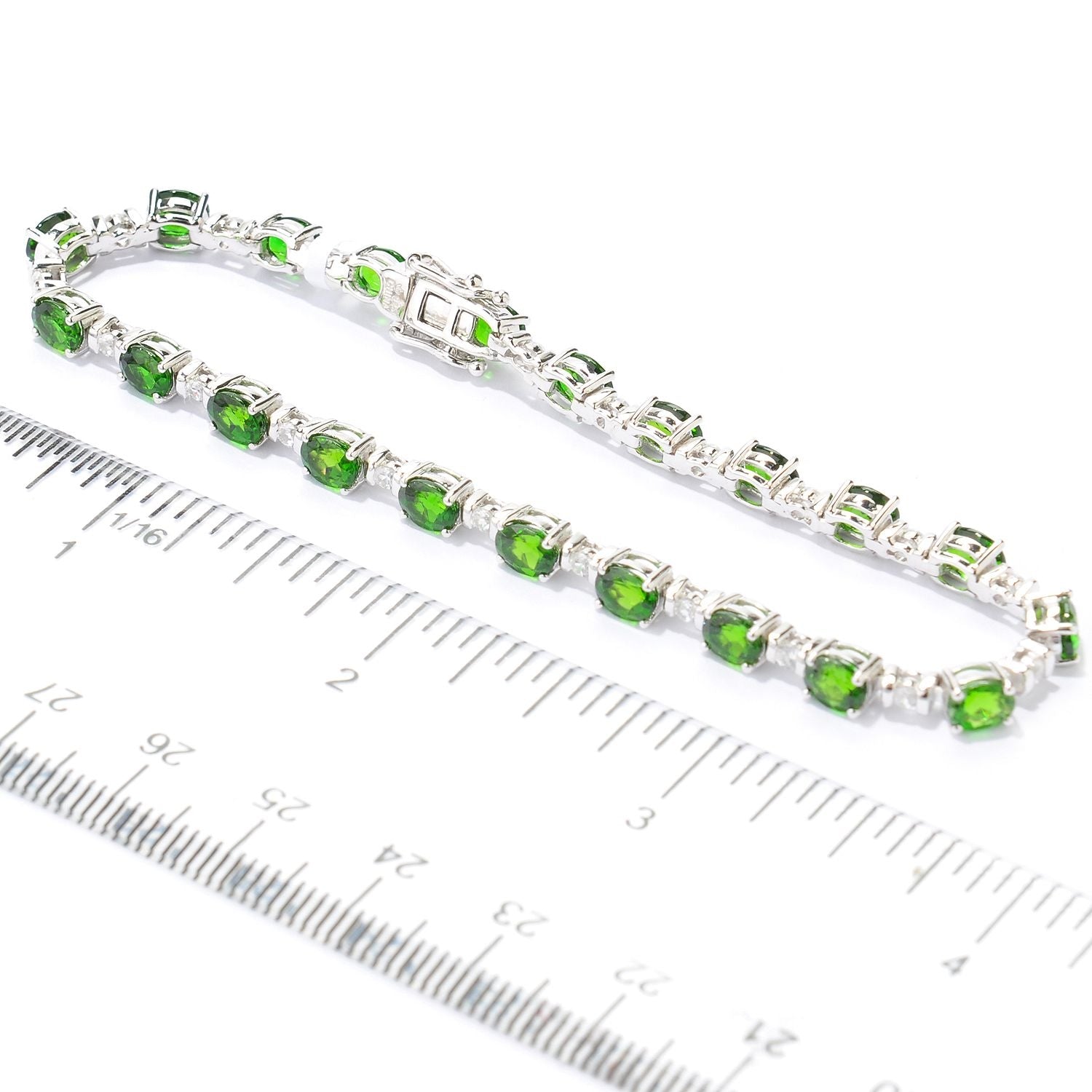 Elevate your jewelry collection with the Pinctore Sterling Silver 9.2ctw Chrome Diopside Tennis Bracelet. This elegant bracelet features a stunning combination of oval chrome diopside gemstones, each measuring 5x4mm, and round white zircon stones, each measuring 2mm. The gemstones are securely set in a mix of prong and bezel settings, ensuring a sophisticated and secure fit. Crafted from high-quality 925 sterling silver, this bracelet exudes timeless elegance and luxury, making it a perfect accessory for both formal and casual occasions.