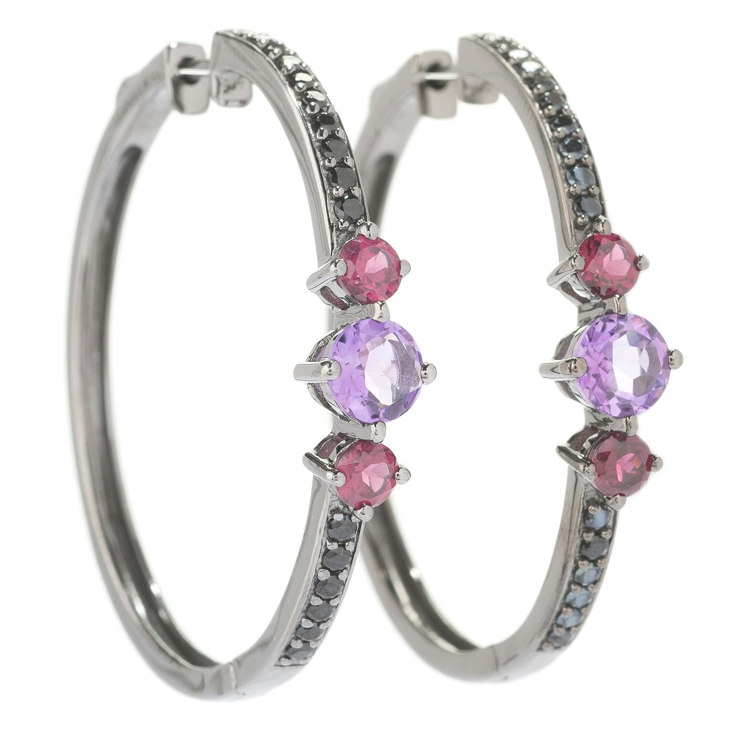 Adorned with rich African amethyst, deep rhodolite garnet, and sparkling white topaz, these earrings offer a luxurious color combination. The opulent shades of purple and red, paired with the brilliance of white topaz, make these hoops ideal for special occasions or sophisticated everyday wear. Each pair is made from sterling silver with an approximate metal weight of 12.42 grams and a total stone weight of 4.02 carats. The dimensions are 1-5/8 inches in length, 1/8 inch in width, and 3/16 inch in height. SKU: E2270WAFAMSTER.