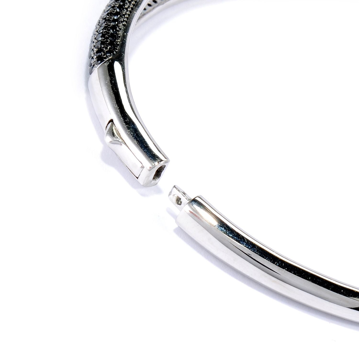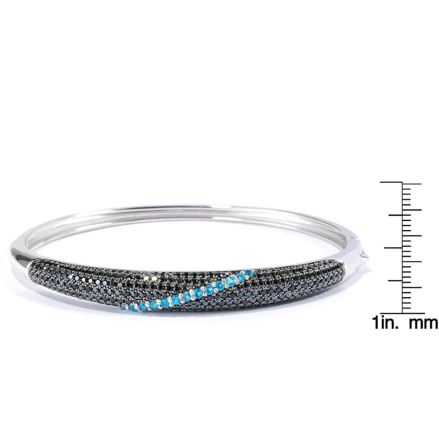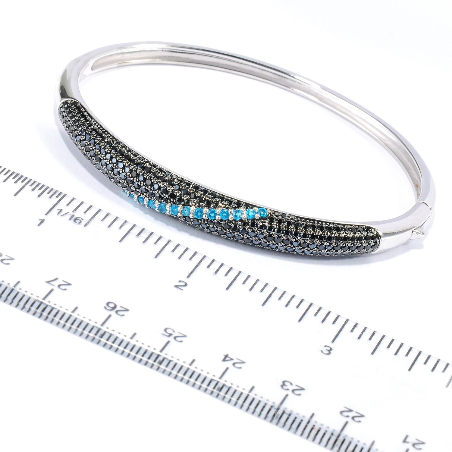 Enhance your style with the Pinctore Sterling Silver Black Spinel Neon Blue Apatite Bangle. This elegant bangle features a striking combination of black spinel and neon blue apatite gemstones, set in high-quality 925 sterling silver. The round black spinel stones, measuring 1.3mm, and the vibrant neon blue apatite stones, ranging from 1.1mm to 2mm, are beautifully arranged in pave and prong settings. The contrast between the deep black spinel and the bright blue apatite creates a stunning visual effect, making this bangle a standout accessory for any occasion.