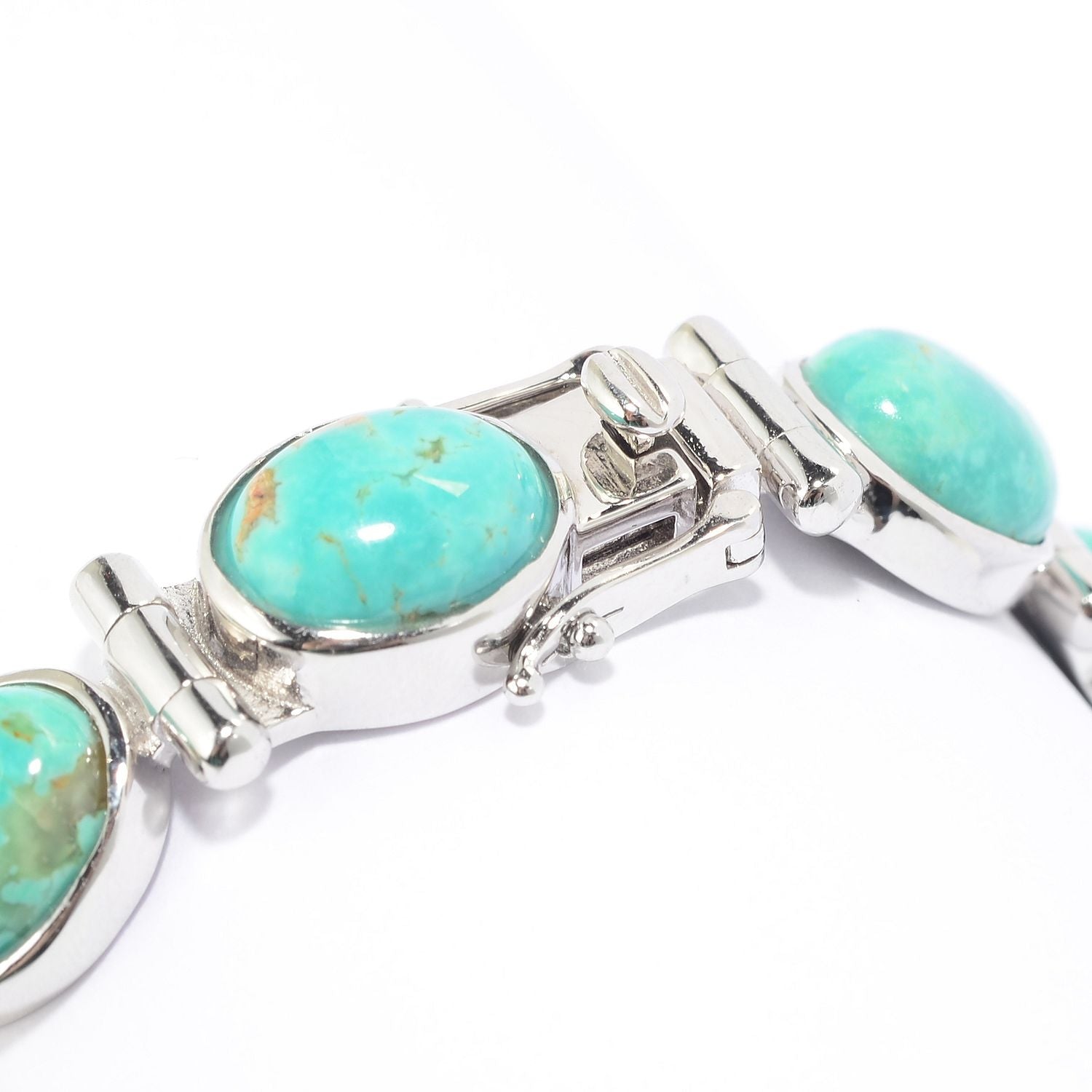 - Gemstones: Features oval-shaped Tyrone turquoise cabochons, known for their vibrant color and unique veining
