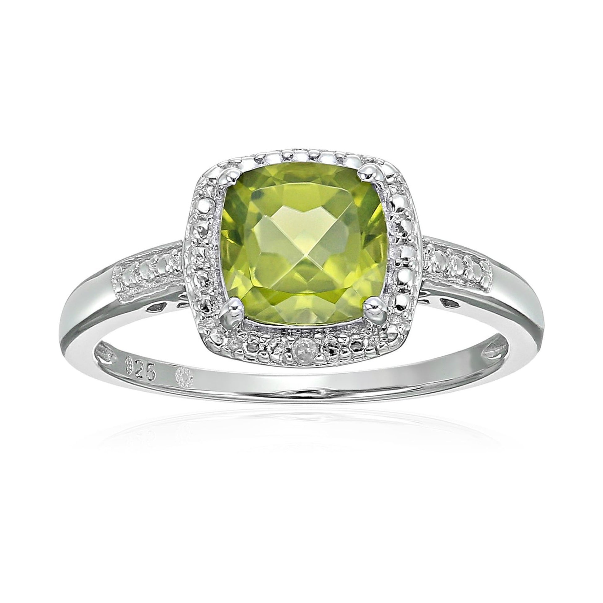 Sterling Silver Cushion Peridot and Diamond Accented Halo Engagement Rings