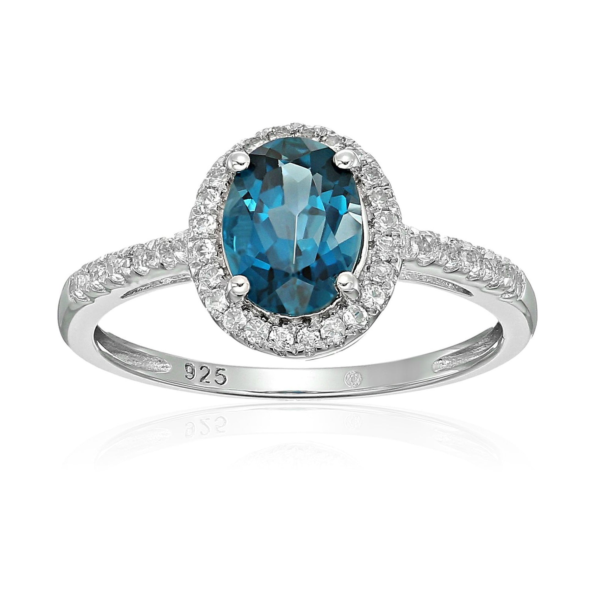 London Blue Topaz Ring: Showcases a mesmerizing 8x6mm oval London Blue Topaz, surrounded by radiant round white zircon accents.