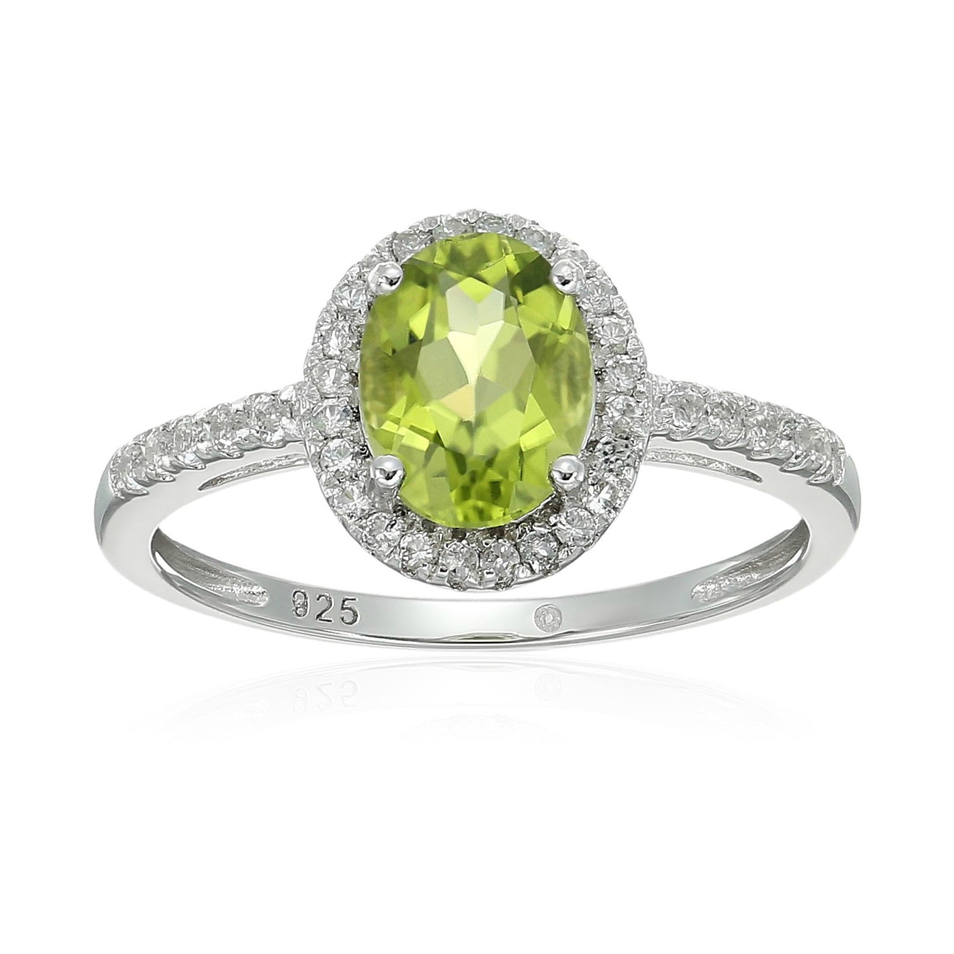 Peridot Ring: Features a vibrant 8x6mm oval peridot, with glimmering round white topaz enhancing its fresh green color.