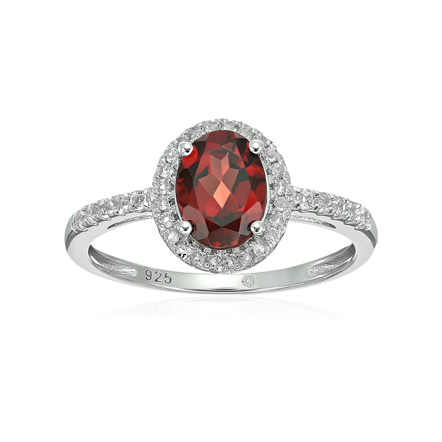 Red Garnet Ring: Displays a rich 8x6mm oval red garnet, accented by brilliant round white topaz, perfect for adding a touch of passion to any outfit.